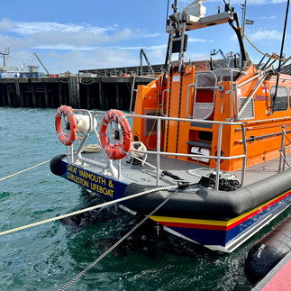 On the day of our visit their Atlantic 85, Robina Nixon Chard, B-916, was away for maintenance. They had a relief boat, Sam and Freda Parkinson, B-941. The seven class boat, Richard Cox Scott, had been retired from service and returned to Poole, this boat had joined Falmouth in 2001. It had been replaced by a relief Shannon class lifeboat, George and Francis Phelon (13-44) which happened to be the boat assigned to Great Yarmouth and Gorleston Lifeboat Station in Norfolk. Unfortunately the mooring pontoon is not suitable for the smaller Shannon class and requires modification so we were unable to board the boat. This is a similar reason why this lifeboat is not allocated to its correct station in Norfolk.
